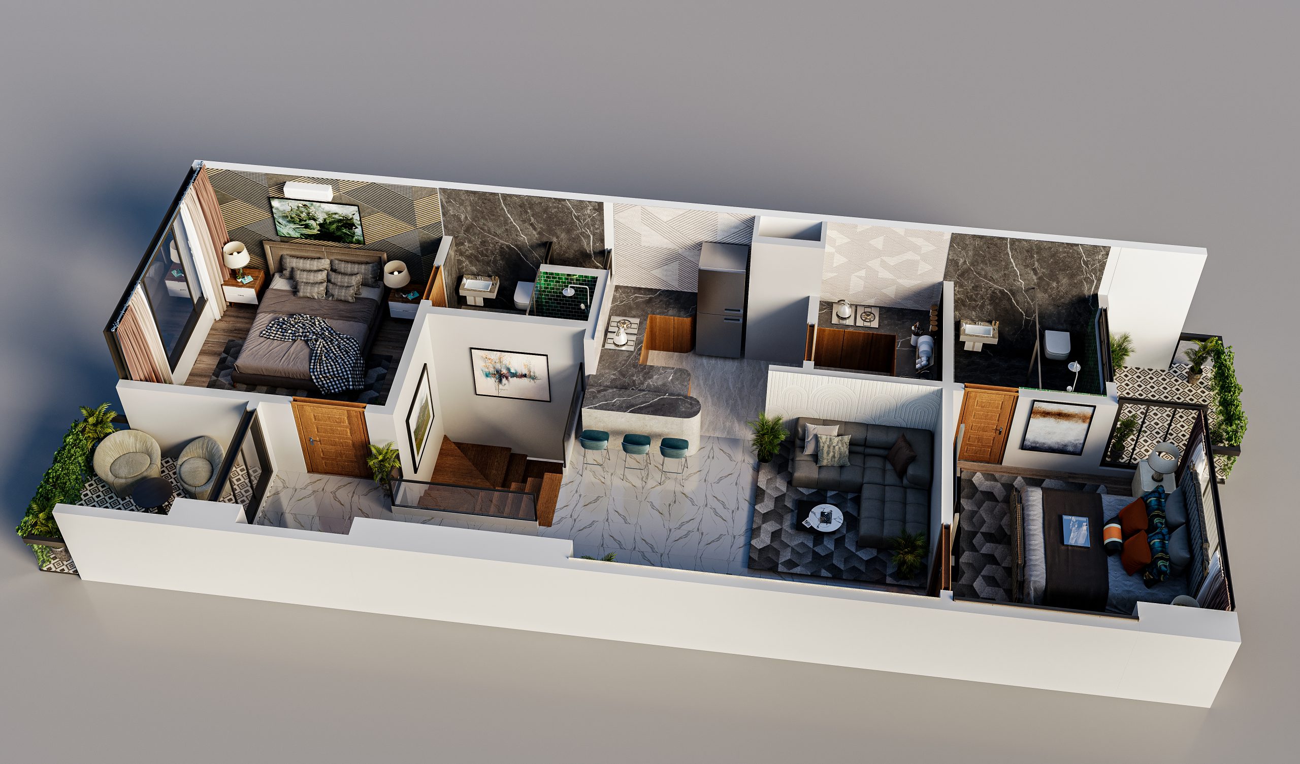 Whether unwinding alone or entertaining guests, the lounge serves as a versatile canvas for relaxation and socialization, elevating the concept of modern living. The kitchen boasts modern amenities with sleek, stainless steel appliances and ample counter space. Its open layout invites culinary creativity, while the soft, ambient lighting creates a cozy atmosphere for preparing and sharing meals.